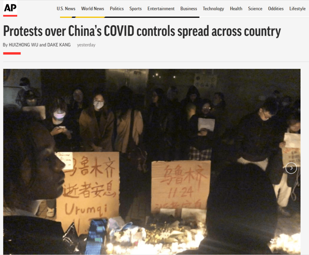 Foquemo-nos num exemplo de uma recente notícia de uma conhecida agência internacional para demonstrar como se falha na independência e isenção jornalística. Trata-se de uma notícia de ontem da Associated Press (AP), intitulada “Protests over China’s COVID controls spread across country”. Em tradução livre: “Protestos sobre medidas covid-19 na China alastram no país”.