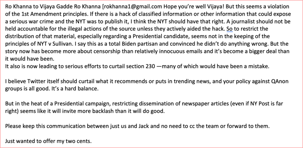 Numa troca humorística no dia 1, o congressista democrata Ro Khanna contacta Gadde para sugerir gentilmente que falem ao telefone. Khanna foi o único [congressista] democrata que encontrei nos ficheiros que expressava preocupação.