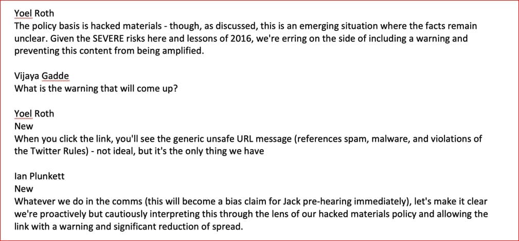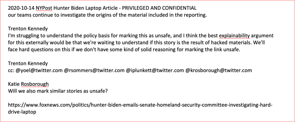 Pode ver a confusão na seguinte longa troca [de e-mails], que acaba por incluir Gadde e o ex-chefe de Confiança e Segurança, Yoel Roth. O funcionário da área de Comunicação, Trenton Kennedy, escreve: “Estou a lutar para compreender a base política para marcar isto como inseguro”:
