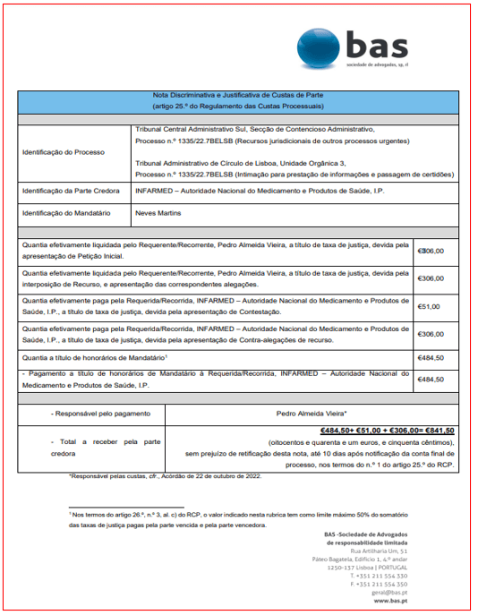 Pela perda deste processo, o PÁGINA UM foi condenado a pagar as custas processuais, pelo que, além das taxas de justiça que teve de arcar (712 euros), teve o seu director que transferir mais 841,50 euros para os cofres do Infarmed.