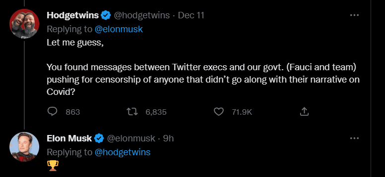 “Deixe-me adivinhar, descobriu mensagens entre executivos do Twitter e o nosso govt. [governo] (Fauci e equipa) a pressionar para a censura de alguém que não acompanhou a sua narrativa na covid?” questionou um utilizador no Twitter. Musk respondeu simplesmente com a imagem de um troféu.