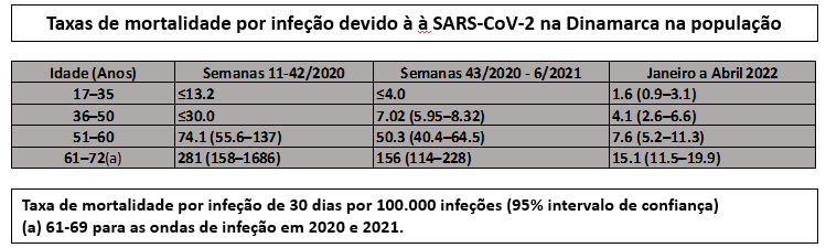 Naquele país escandinavo, a taxa de letalidade da infecção por Ómicron até meados de Março de 2022 foi estimada em apenas 1,6 por 100.000 infecções (0,0016%) entre pessoas dos 17 aos 35 anos de idade, situando-se nos 6,2 por 100.000 infecções (0,0062%) entre pessoas aparentemente saudáveis dos 17 aos 72 anos de idade. Mesmo para as pessoas mais idosas, a taxa de letalidade desceu substancialmente: é agora de apenas 0,015,1, quando em 2020 atingia os 0,281%.
