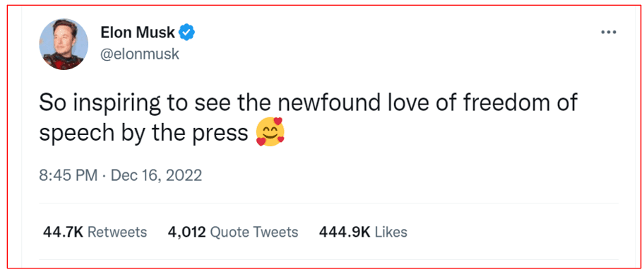 ENQUANTO ELON MUSK SE MOSTRA "INSPIRADO" COM O NOVO AMOR DA IMPRENSA MAINSTREAM PELA LIBERDADE DE EXPRESSÃO