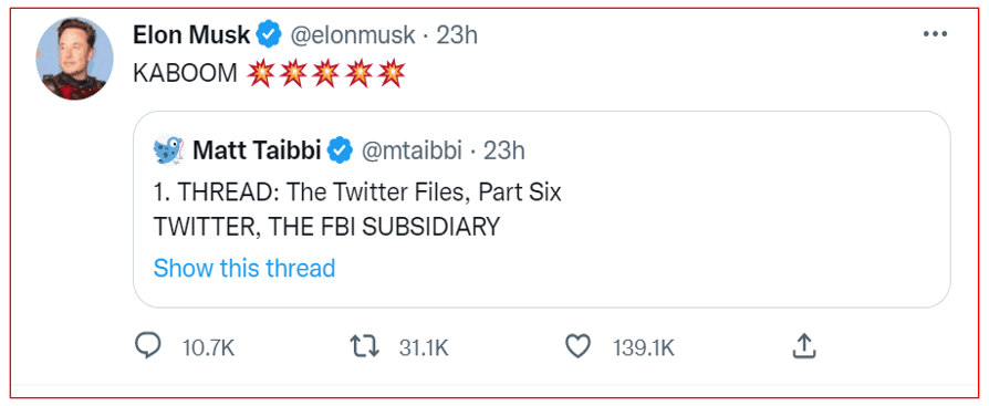 Enquanto a imprensa mainstream vocifera contra Elon Musk por ter suspendido temporariamente contas de jornalistas norte-americanos que revelaram a localização online do seu avião, continuam as revelações bombásticas sobre os procedimentos da anterior administração do Twitter. Ontem mesmo o novo dono da rede social já tinha feito um tweet comentando a divulgação da sexta série dos #Twitter Files, novamente a cargo do jornalista independente Matt Taibbi, com um “KABOOM”, seguido de ícones de cinco explosões.