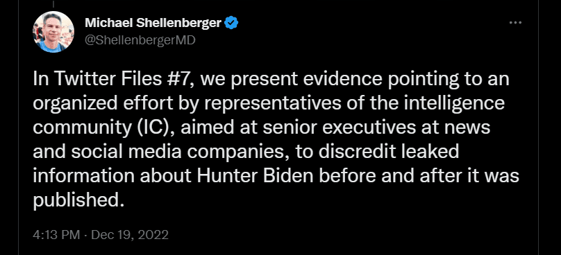 Na sétima parte dos “Twitter Files, o escritor Michael Shellenberger revelou a campanha de desinformação levada a cabo pelo FBI e serviços de informação norte-americanos junto das redes sociais, e especialmente do Twitter, e de órgãos de comunicação social para desacreditarem informação verídica sobre o caso do portátil do filho de Joe Biden, actual presidente dos Estados Unidos, que mostrava relações promíscuas com empresas ucranianas. Ficou também a saber-se que os contribuintes norte-americanos pagaram, através do FBI, mais de 3,4 milhões de dólares ao Twitter, em pouco mais de um ano, para alegadamente compensar o tempo gasto por funcionários daquela rede social a responder às suas solicitações.