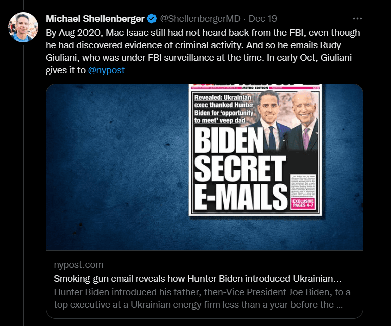 Segundo Shellenberger, o FBI pressionou o Twitter para que suprimisse a polémica história sobre o portátil de Hunter Biden, publicada pelo jornal New York Post em Outubro de 2020, que dava conta de negócios suspeitos entre o filho do actual presidente norte-americano e empresários ucranianos. ↓