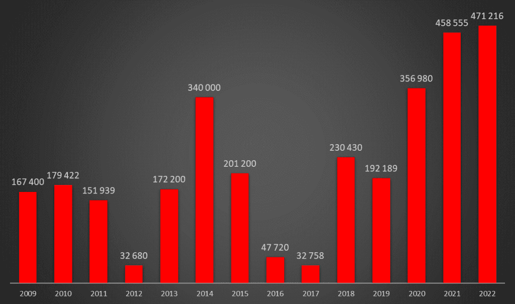 Se se considerar a média dos 10 anos anteriores a 2020, a SRS registara apenas um valor anual de 158.054 euros, que contrasta com os 428.917 euros de média anual do triénio 2020-2022. Ou seja, um aumento de 171%.