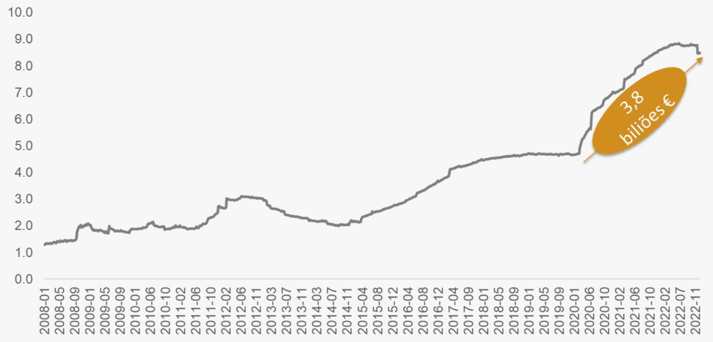Eles pediram, a Sra. Lagarde deu-lhes: imprimindo 3,8 biliões de euros (12 zeros), cerca de 19 vezes o Produto Interno Bruto português, entre o início de 2020 e o final de 2022, tal como podemos observar na próxima imagem.