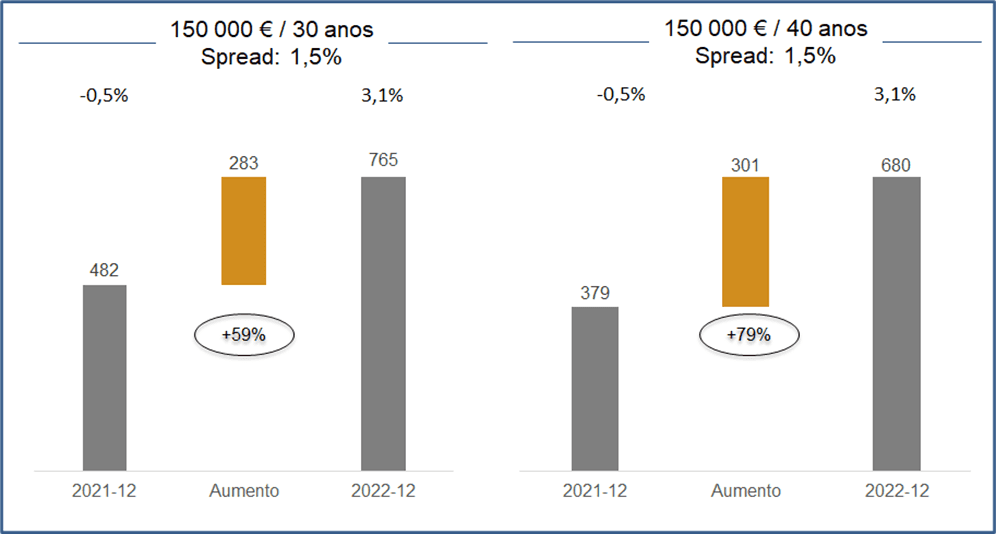 A situação afigura-se dramática. Analisemos o impacto da recente subida (+3,1%) e comparemos com os valores no final de 2021 (-0,5%), usando o exemplo de um crédito à habitação de 150 mil euros, indexado à Euribor a 12 meses e com um spread de 1,5%, usando dois cenários: (i) financiamento a 30 anos; e (ii) a 40 anos.