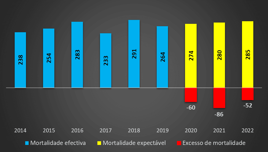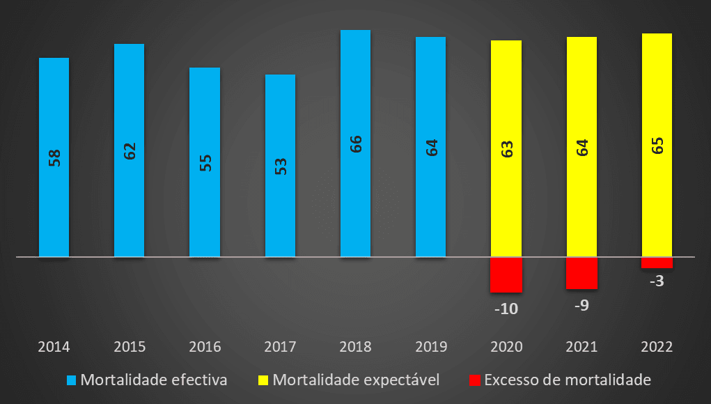 Sem pandemia, em 2021 estimava-se a morte de 300 jovens destas idades, mas acabaram por falecer mais 12. Já no ano de 2022, que agora terminou, ainda se agravou mais: seria de esperar uma mortalidade total ao longo dos meses de 296 óbitos, mas o valor suplantou em 25,5% essa fasquia: contaram-se 371 mortes, mais 75 do que seria de aguardar. Desde 2014, o máximo ocorrera em 2017, com 326 óbitos. ↓