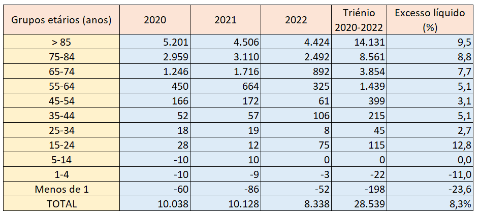 Também nos dois grupos subsequentes, entre os 45 e os 64 anos) se conta excesso de mortalidade em qualquer um dos três últimos anos, embora mais moderado em 2020 face a 2021 e 2022.