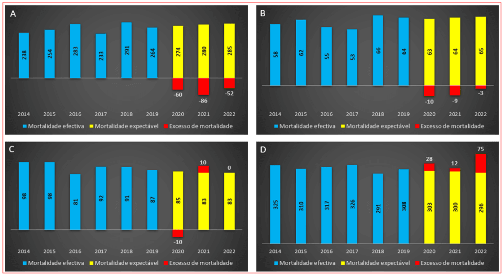 Note-se mais uma vez que este é um “excesso líquido”, uma vez que seria sempre expectável tal incremento de cerca de 1.500 óbitos por ano. Ou seja, face ao triénio anterior, o triénio 2020-2022 teria, em situações normais, um acréscimo de cerca de nove mil óbitos mesmo com as habituais doenças.