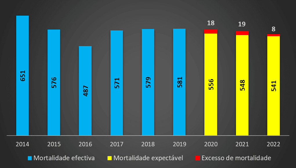Os três últimos anos vieram, contudo, inverter fortemente essa tendência. Em 2020 observou-se um excesso líquido de 2.959 óbitos; no ano seguinte de 3.110 mortes e em 2022 contabilizaram-se mais 2.492 óbitos do que o expectável. No total registou-se assim um acréscimo de 8.561 mortes acima do esperado.