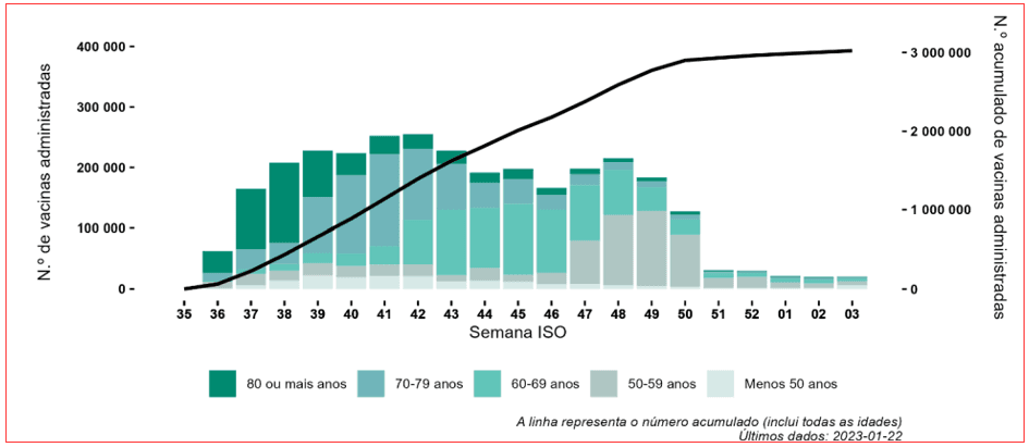 Na primeira quinzena de Janeiro, a procura também já fora pequena: 21.006 e 19.531 doses, respectivamente, nas semanas 1 e 2 deste ano. Nos dias da semana 2 em que já poderiam vacinar-se adultos sem comorbilidades graves até aos 49 anos, a adesão terá sido residual, porque este grande grupo etário (cerca de 40% da população nacional) nem surge com representatividade no gráfico apresentado no segundo relatório de 2023 da DGS. ↓