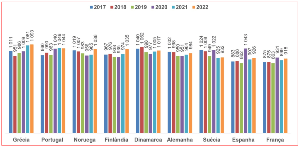 Analisando a média de óbitos por 10 mil habitantes para o mesmo grupo etário, em particular comparando o triénio 2020-2022 vs. 2017-2019, podemos constatar que a Suécia apresenta o melhor desempenho, com uma queda de 34 óbitos por 10 mil habitantes, uma vez mais melhor que os demais países nórdicos – nem vale a pena falarmos do desastre Portugal.
