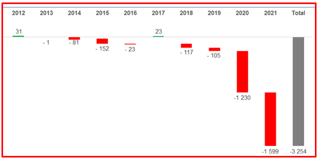 Só em 2021 a empresa registou prejuízos recorde de 1.599 milhões de euros. Mas já no exercício de 2020 – em plena pandemia e restrições nas viagens – o ano foi de perdas: 1.230 milhões de euros de prejuízos. Ou seja, em apenas dois anos, a TAP contabilizou prejuízos da ordem dos 2.800 milhões de euros. Está no vermelho desde o exercício de 2018, depois de um ano positivo em 2017, pois em anos anteriores também esteve quase sempre no vermelho.