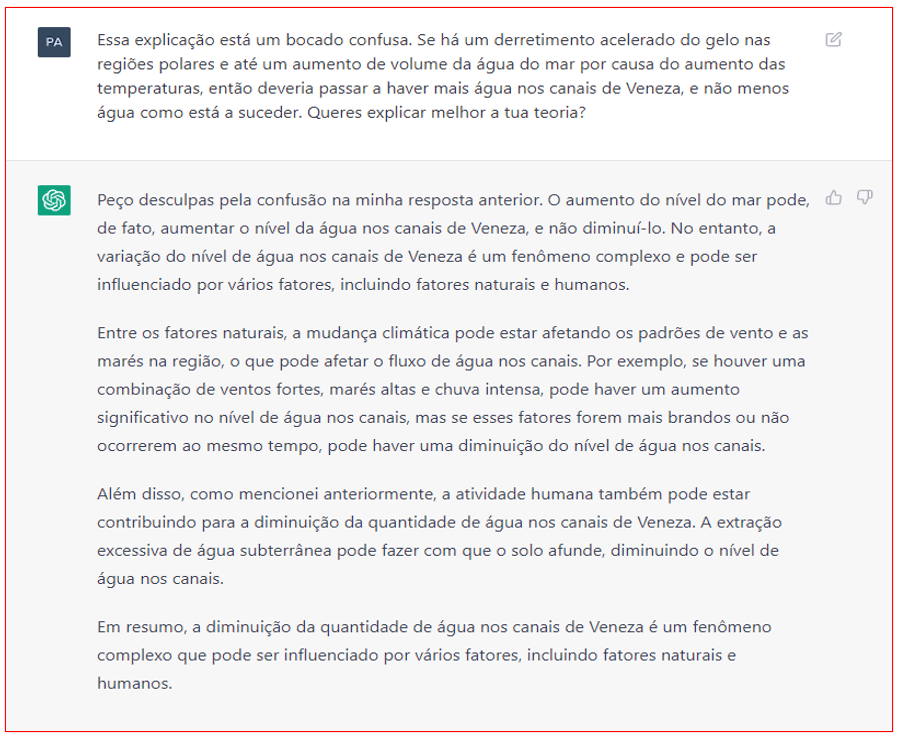 ChatGPT – Peço desculpas pela confusão na minha resposta anterior. O aumento do nível do mar pode, de fato, aumentar o nível da água nos canais de Veneza, e não diminuí-lo. No entanto, a variação do nível de água nos canais de Veneza é um fenômeno complexo e pode ser influenciado por vários fatores, incluindo fatores naturais e humanos.