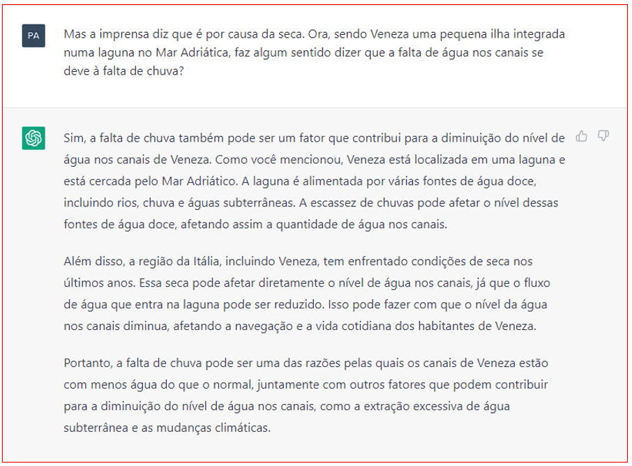 Sem mais delongas, deliciem-se, portanto, com a minha conversa integral com o (pobre) ChatGPT sobre a causa da seca dos canais em Veneza: