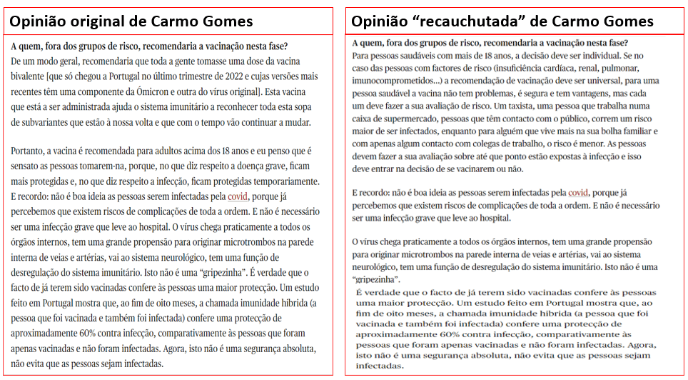 Parte desta resposta entretanto desapareceu (os trechos acima marcados a negro em itálico), onde até se falava de uma “sopa de subvariantes” (uma parvoíce, diga-se), e a pequena entrevista viu então acrescentados os seguintes novos trechos, tendo até o título alterado para “Covid: Para pessoas saudáveis, a decisão de vacinação deve ser individual“, que não constavam, portanto, da entrevista original: