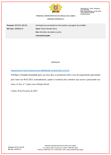 Face às manifestas mentiras do Ministério da Saúde, o PÁGINA UM remeteu ao Tribunal Administrativo de Lisboa um conjunto de provas documentais sobre a existência dos quatro contratos do início de 2021, bem como do “apagão” desses documentos no Portal Base ordenado pelo Ministério da Saúde. Em consequência, a juíza do processo, Telma Nogueira, exarou um despacho no passado dia 20 de Fevereiro com o seguinte conteúdo: “Notifique a Entidade demandada [Ministério da Saúde] para, em cinco dias se pronunciar sobre o teor do requerimento apresentado pelo Autor [PÁGINA UM] em 06.02.2023, nomeadamente, quanto à existência dos contratos cujo acesso é peticionado nos autos, cf. doc. n.º 1 junto com a Petição Inicial.”