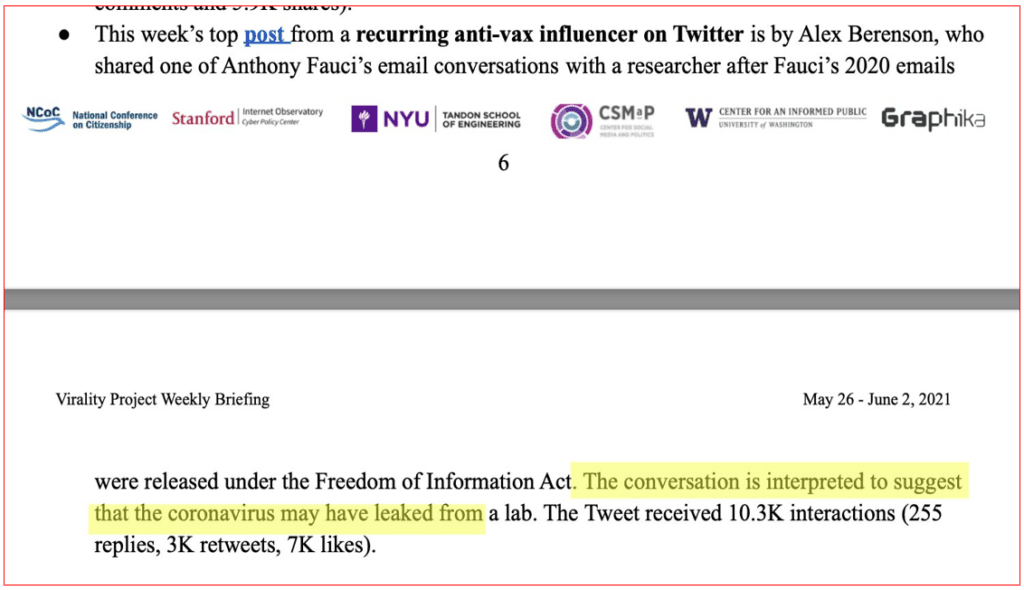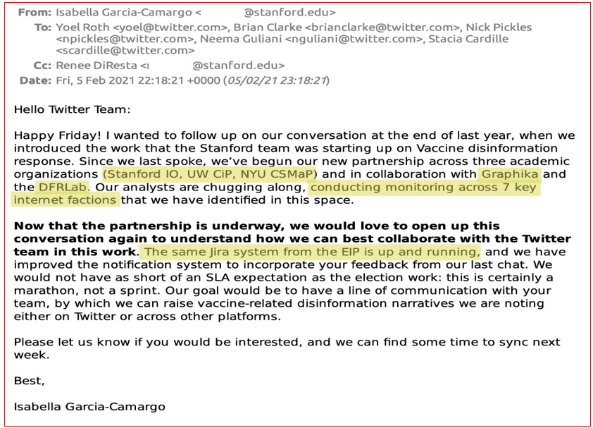 A parceria entre o Twitter e o Virality Project teve início pouco tempo depois da tomada de posse de Joe Biden, em Fevereiro de 2021. Nesse mês, a rede social recebeu o primeiro relatório semanal sobre “desinformação anti-vacinas” que, no entanto, continha “inúmeras histórias verdadeiras”, como salienta Matt Taibbi.