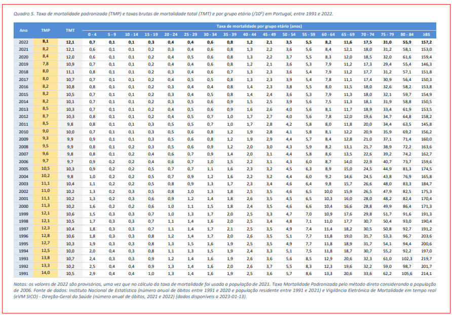 Embora estranhamente o relatório do INSA não tenha desejado interpretar a evolução das taxas de mortalidade padronizada e por grupos etários, uma tabela (e gráficos) com a evolução destes indicadores entre 1991 e 2022 para cada um dos intervalos de idades – a começar dos 0 aos 4 anos e a terminar nos maiores de 85 anos –, uma análise do PÁGINA UM permite aferir facilmente que a probabilidade de morte em 2013 foi superior (8,5 por mil habitantes ) à de qualquer dos três anos da pandemia: 2020 (8,4 por mil habitantes), 2021 (8,2 por mil habitantes) e 2022 (8,1 por mil habitantes). Se recuarmos para as datas anteriores a 2013, e até 1991, o cenário é idêntico: genericamente, a taxa de mortalidade padronizada situou-se acima (e, por vezes, bem acima) da registada no triénio da pandemia.