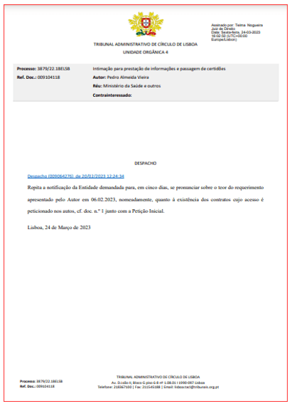 Em consequência, a juíza do processo, Telma Nogueira, exarou um despacho no passado dia 20 de Fevereiro com o seguinte conteúdo: “Notifique a Entidade demandada [Ministério da Saúde] para, em cinco dias se pronunciar sobre o teor do requerimento apresentado pelo Autor [PÁGINA UM] em 06.02.2023, nomeadamente, quanto à existência dos contratos cujo acesso é peticionado nos autos, cf. doc. n.º 1 junto com a Petição Inicial.”
