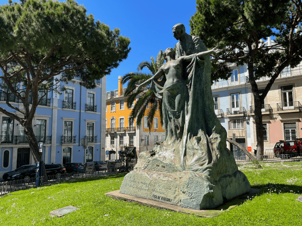 Não resisto ainda a contar aquilo que, certa vez, uma pessoa da família de Eça, partilhou como sendo uma pequena anedota sobre a inauguração da sua estátua no Largo Barão de Quintela – a original, em pedra, do escultor Teixeira Lopes, inaugurada em 1903 e que hoje está no jardim do Museu da Cidade, no Campo Grande e que, por ser constantemente vandalizada, foi substituída por uma réplica em bronze.