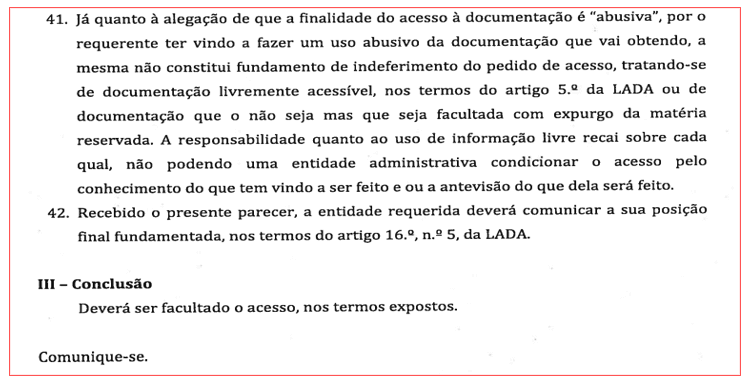 Para a CADA, “a responsabilidade quanto ao uso de informação livre recai sobre cada qual, não podendo uma entidade administrativa [como é a CCPJ] condicionar o acesso pelo conhecimento do que tem vindo a ser feito e ou a antevisão do que dela será feito”.