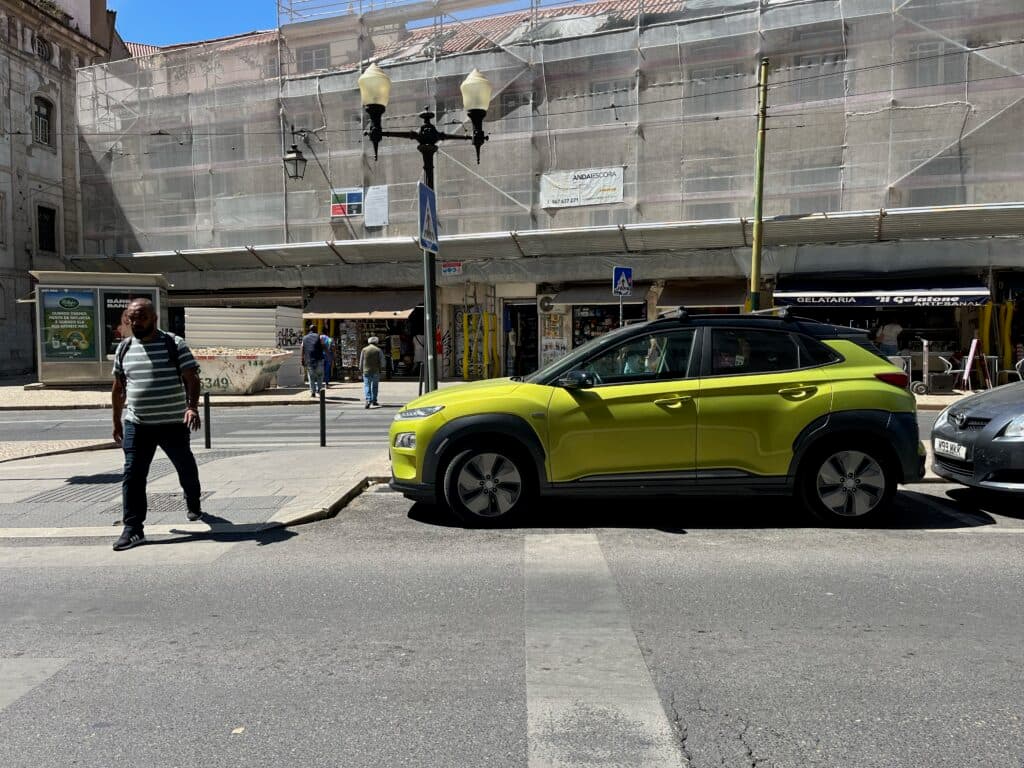 Fomos encontrar um terceiro exemplo na Rua da Palma, a caminho da Praça do Martim Moniz para Praça da Figueira, na parte lateral do Hotel Mundial. Um dos lugares de estacionamento viola o limite de cinco metros, impedindo a visibilidade para o atravessamento em segurança dos peões.