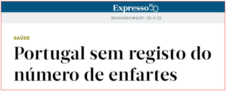 Uma notícia da última edição de Abril deste ano do semanário Expresso era taxativa: “Portugal sem registo do número de enfartes”. No corpo da notícia, Hélder Pereira, presidente da Sociedade Portuguesa de Cardiologia, explicava que “em Portugal, o registo de casos de enfarte no Registo Nacional de Síndromes Coronários Agudos feito pelos hospitais é voluntário. “Nem metade dos enfartes que acontecem estão registados”, sublinhava.