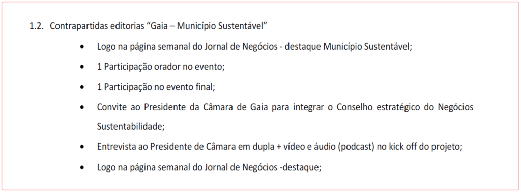 Para além de custear a realização de um ciclo de três conferências temáticas, uma das quais obrigatoriamente em Vila Nova de Gaia, este contrato serviu para se conseguir um “convite ao Presidente da Câmara de Gaia [Eduardo Vítor Rodrigues] para integrar o Conselho Estratégico do Negócios Sustentabilidade]”, bem como uma entrevista que acabou por ser transformada num depoimento e artigo noticioso do Jornal de Negócios de 25 de Outubro do ano passado.
