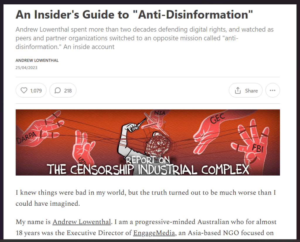 E como é que vê a sua evolução? Porque o problema está a crescer, as entidades por detrás deste complexo industrial de censura estão a tornar-se maiores, é uma indústria gigante… Por isso, como é que nós enquanto cidadãos podemos desmantelar isto, o que é que podemos fazer?