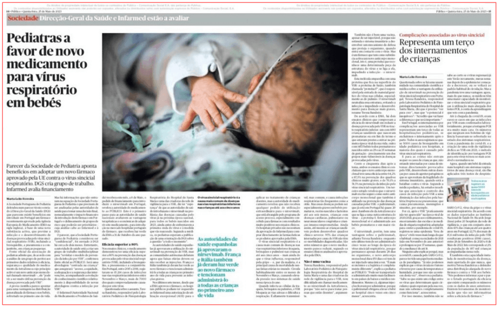 E, claro, a manchete do passado dia 25 de Maio, intitulada “Pediatras dão parecer favorável a novo medicamento contra o vírus sincicial em bebés. DGS e Infarmed avaliam”.