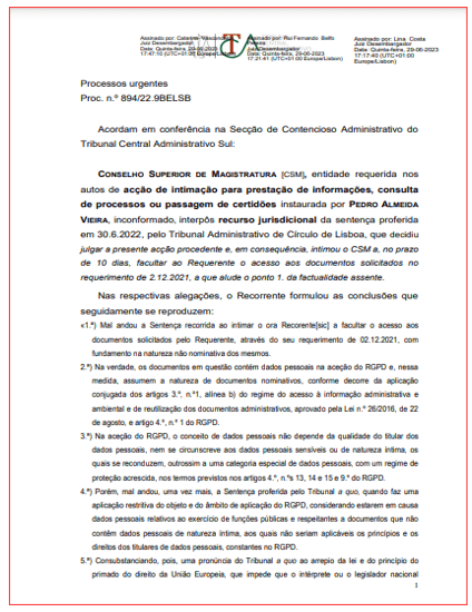 A sentença do Tribunal Administrativo de Lisboa, anunciada em Junho do ano passado era já claríssima: “Em face do que antecede, julgo a presente acção intentada por Pedro Almeida Vieira [director do PÁGINA UM] procedente e, em consequência, intimo o Conselho Superior da Magistratura [CSM] a, no prazo de 10 dias, facultar-lhe o acesso aos documentos por aquele solicitados através do seu requerimento de 2 de Dezembro de 2021”.