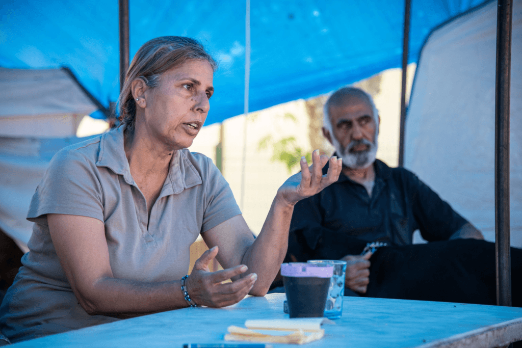“Aqui, nas tendas, estamos juntos”, conta a mulher de cabelo negro. “E queremos mesmo ficar juntos; é a única coisa que nos resta – uns aos outros!”