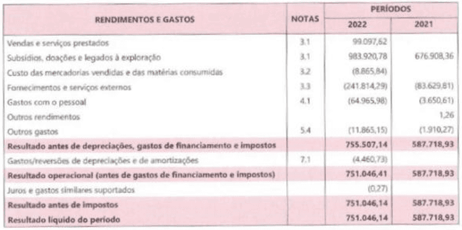 O dinheiro transferido para os bolseiros ou para as instituições de ensino estará, afinal, integrada no fluxo de pagamento a fornecedores (que, em 2022, atingiram 284.229 euros), não constituindo um pagamento ao pessoal (56.5454 euros, nesse ano). O valor que surge nas actividades operacionais como “Recebimentos de clientes e utentes” (que está com valor negativo), num total de 99.098 euros, será relativo às vendas de merchandising.