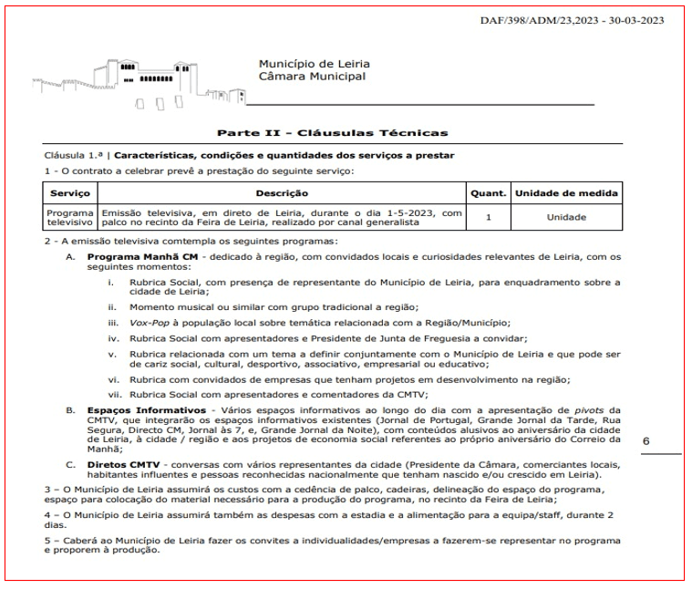 Em todo o caso, entre os contratos já publicados no Portal Base (Marco de Canavezes, Ourém, Coimbra, Beja e Leiria), consultados e gravados pelo PÁGINA UM, ressaltam sobretudos as cláusulas detalhadas nos casos em que também estão publicados os cadernos de encargos. E é aí que deixa de haver margem para dúvidas sobre a promiscuidade e mesmo ilegalidade dos contatos: constam expressamente cláusulas que mostram que informação transmitida pelos noticiários da CMTV foram condicionados, e aceites pela direcção editorial, por uma entidade externa ao canal de televisão a troco de dinheiro. E mesmo que não houvesse dinheiro envolvido. Situações que violam, de forma marcante, a Lei da Imprensa, colocando também a questão se tal se verifica com entidades privadas cujos contratos não são públicos.