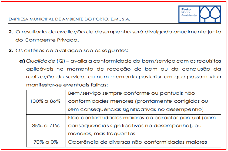 Contudo, onde efectivamente se mostra a bizarrice deste acordo comercial é na cláusula 7ª sobre a “avaliação de desempenho do Contraente Privado”, isto é, do Público, cujo resultado “será divulgado anualmente”, e do qual resultará um “Índice de Qualidade do Fornecedor”, utilizando os critérios ponderados. E, aparentemente, a Porto Ambiente exige elevada excelência.