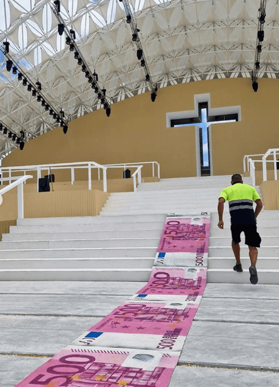 É o protesto do momento: Bordalo II – nome artístico de Artur Bordalo –, disfarçou-se de operário e desenrolou ontem nas escadarias do altar, que será pisado na próxima semana pelo Papa Francisco na Jornada Mundial da Juventude, um longo tapete de falsas notas gigantescas de 500 euros.