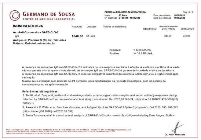 Poucas semanas depois, sucedeu algo que me “beneficiou”: tive confirmadamente covid-19, com dores de garanta, um pouco de mal-estar geral. Tive muitas gripes muito piores. Passou em dois dias. Que fiz: novo teste serológico para saber – tinha de fazer isso para ser Ciência – como evoluíram os anticorpos IgG. Pois bem, subiram para 846 BAU/ml. Terá sido, enfim, o equivalente a um “booster” natural, certo?