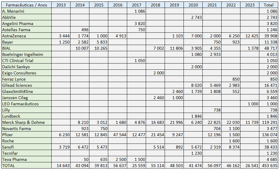 N.D. A descrição, entre aspas, é aquela que consta no Portal da Transparência e Publicidade. No caso de empresas subsidiárias de farmacêuticas, optou-se por as agregar e atribuir o apoio (e relação comercial) à empresa-mãe.