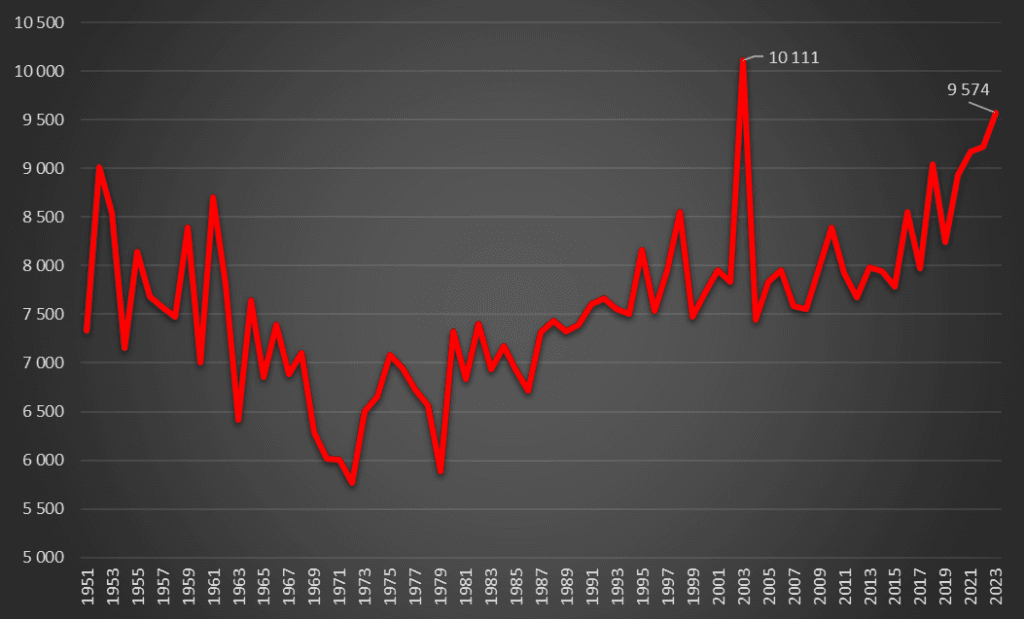 Consultando os dados do INE desde 1951, e compilando os últimos registos diários do Sistema de Informação dos Certificados de Óbito (SICO), o Agosto de 2023 é o segundo pior, embora o terceiro consecutivo acima dos 9.000 óbitos: em 2021 contabilizaram-se 9.227 mortes e no ano passado 9.309 mortes. Saliente-se que antes de 1951 registaram-se alguns meses de Agosto mais mortíferos, mas nessa época a mortalidade no Verão estava sobretudo associado a doenças associadas à falta de higiene e problemas de saneamento que proliferavam com o aumento da temperatura na época de estio. ↓