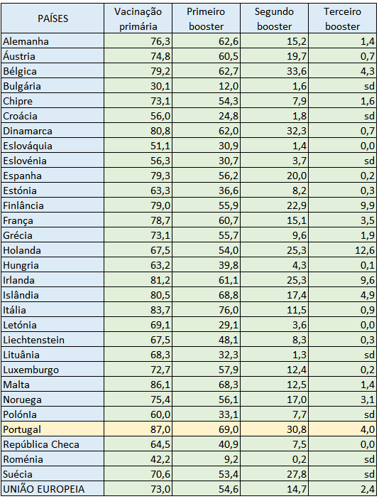 Em termos globais, a ECDC aponta assim para uma adesão de apenas 2,4% dos europeus aos terceiro booster, quando atingira 14,7% no segundo booster, os 54,6% no primeiro booster e os 73% na vacinação primária. Em termos absolutos, nos países europeus abrangidos pelo ECDC (União Europeia e ainda Islândia, Liechtenstein e Noruega), foram administradas mais de 330 milhões de doses em vacinação primária (houve cerca de 342 milhões de pessoas que optaram apenas por uma dose), baixando para 248 milhões quando as autoridades consideraram a necessidade de um reforço. Ao segundo reforço só responderam já um pouco menos de 67 milhões de pessoas. E para o terceiro booster já só mostraram interesse menos de 9 milhões de europeus. Assim, entre a vacinação primária e o terceiro reforço, contabiliza-se uma redução de 97,3%.