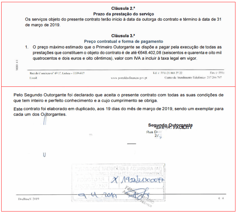 Com uma duração de apenas 13 dias, porque só foi assinado no dia 19 e expirava a 31 de Março, envolveu um pagamento de 648.402 euros, significando assim que, formalmente, em cada um dos poucos dias deste contrato de limpeza a Autoridade Tributária pagou 49.877 euros à Samsic. No mês seguinte, em Abril, entraria em vigor um novo contrato por ajuste directo, que durou 275 dias, até ao final do ano. Como teve um preço contratual de 1.984.242,74 euros, significa que por dia custou 7.215 euros, bem demonstrativo de que o contrato de Março de 2019 foi forjado para ter um preço médio mais de sete vezes superior.