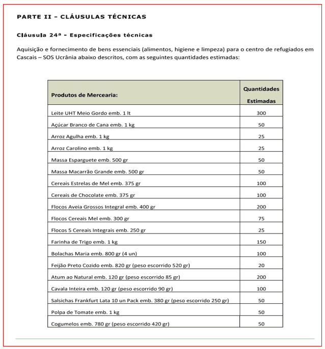 No contrato exposto no Portal Base inclui-se, neste caso, o caderno de encargos com as especificações para a aquisição de bens essenciais para o Centro de Refugiados de Cascais, onde consta uma extensa lista de produtos alimentares e de higiene que a autarquia liderada por Carlos Carreiras devia receber do Modelo Continente.
