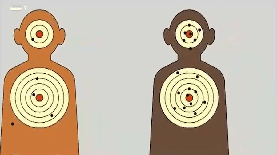 O cartoon, em formato vídeo, da autoria da experiente e ilustradora Cristina Sampaio – que integra o colectivo Spam Cartoon – retratava um polícia numa carreira de tiro a disparar contra vários alvos, constatando-se por fim uma gradação comprometedora gradação no nível de “acerto”: o primeiro alvo. representando um homem branco, tinha apenas um tiro, mas ao lado do corpo, enquanto o quarto “alvo”, representando um homem negro, estava ‘fulminado” com certeiros sete tiros na cabeça e 11 tiros no tronco.