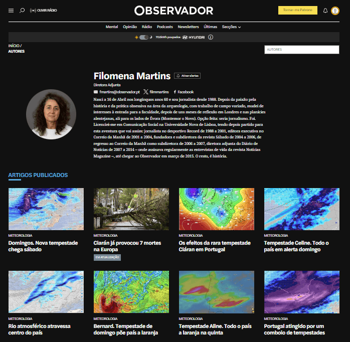 Não. A directora-adjunta do Observador – que em 44 textos escritos este ano, 34 vezes dedica-os à meteorologia – não é assim tão simplista. Por exemplo, hoje anuncia que a tempestade Domingos “não será tão devastadora como a sua ‘irmã’ Ciarán, porque a ciclogénese explosiva se produzirá no mar”.