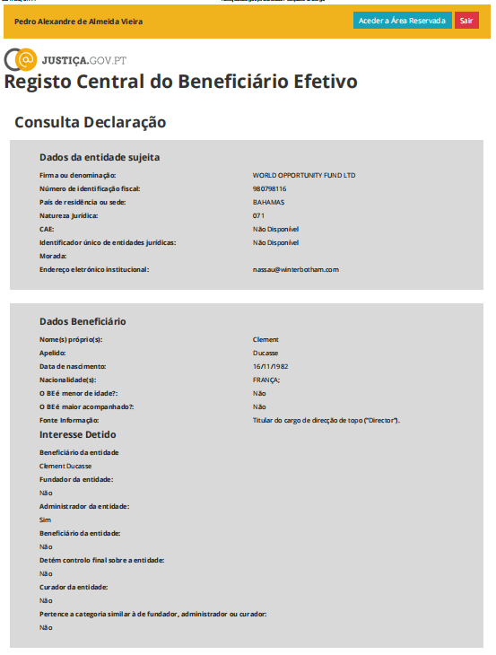 Mas uma consulta específica na base de dados do Registo Central do Beneficiário Efectivo do Ministério da Justiça deu um nome em concreto: Clement Ducasse, que, curiosamente, continuava sem estar associado ao World Opportunity Fund Ltd, sócio maioritário da Páginas Civilizadas, no registo alterado ontem no Portal da Transparência dos Media, gerido pela ERC.