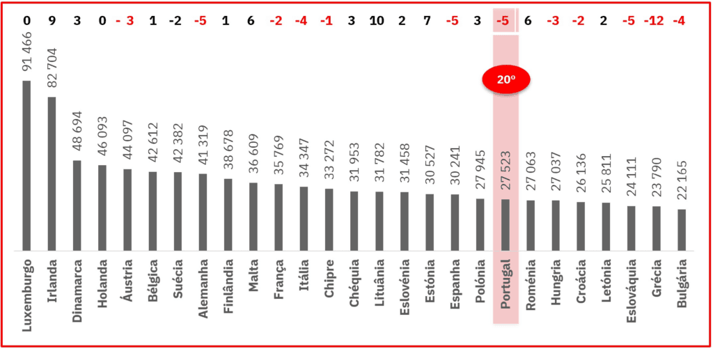 Qual foi o resultado do governo liderado pelo homem que tem recebido inúmeros panegíricos pelos órgãos de propaganda, com muitos a porem as mãos na fogueira pela sua honestidade? Estamos agora na vigésima posição no conjunto dos 27 países da União Europeia, voltando a perder duas posições entre 2015 e 2022. Atenção, para a posição do carro vassoura já não falta muito. A Roménia e a Hungria estão à porta.